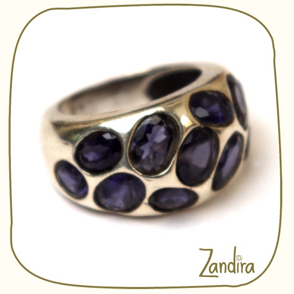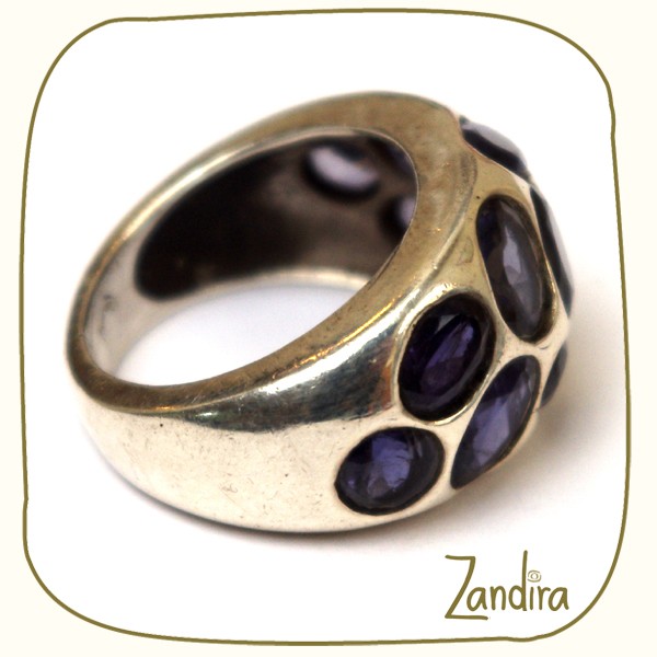 Une bague arrondie en argent sur laquelle sont disposées onze petites pierres rondes violettes (améthyste).