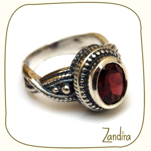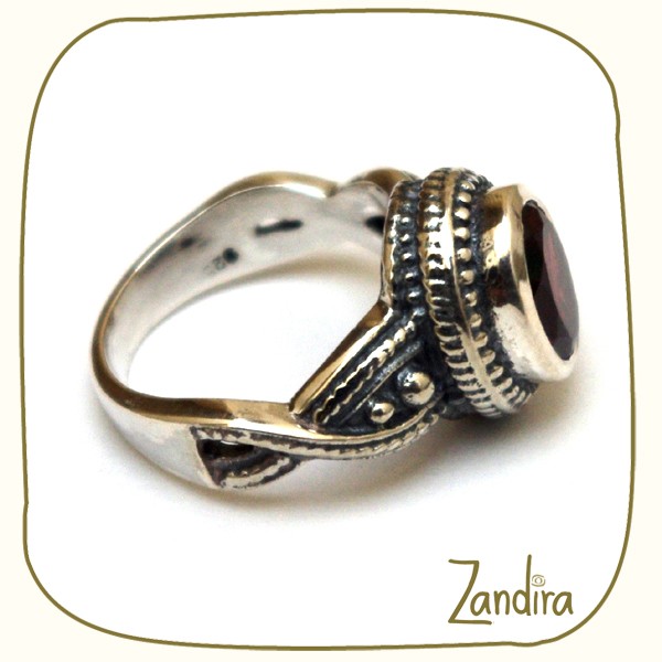 Bague finement ciselée en argent portant une petite pierre ronde rouge (grenat). Ce modèle existe aussi avec une pierre bleue (turquoise).