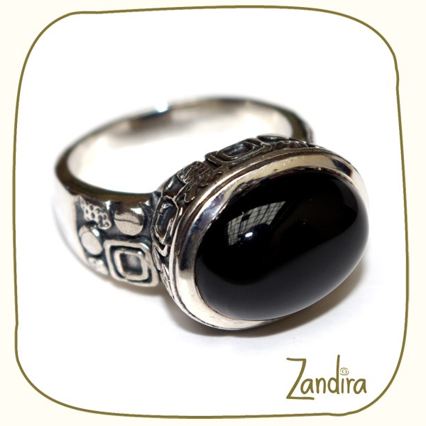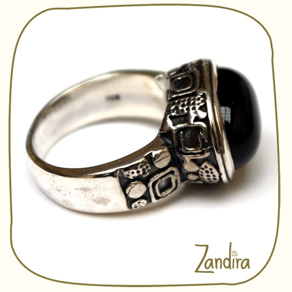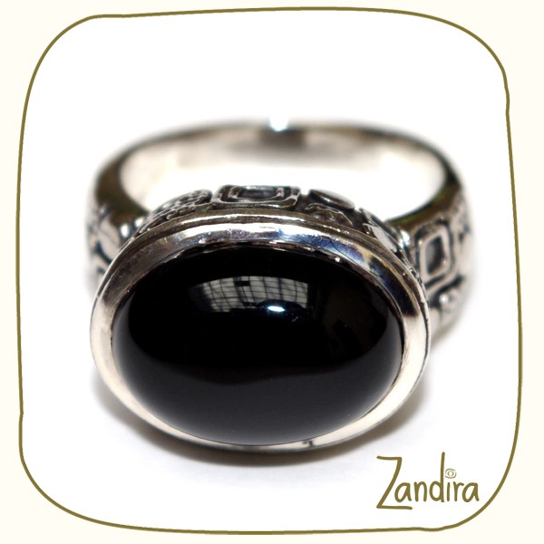 Une bague en argent travaillé portant une pierre noire ovale (onyx noir) sur une monture sculptée.