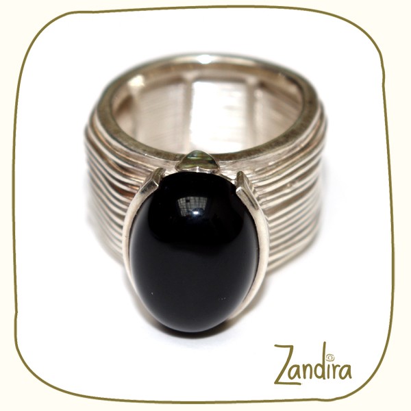 Une bague en argent dont la largeur donne l'impression d'une juxtaposition de fils d'argent, et qui est surmontée d'une pierre ovale noire (onyx noir). Ce modèle existe aussi avec une pierre bleue (onyx bleu) ou une pierre rouge (onyx rouge).