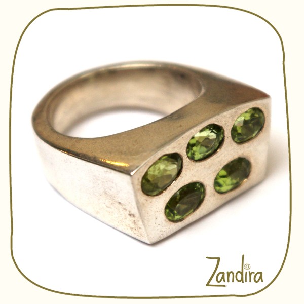 Bague en argent avec un dessus plat allongé incrusté de 5 petites pierres rondes vert clair (péridot).